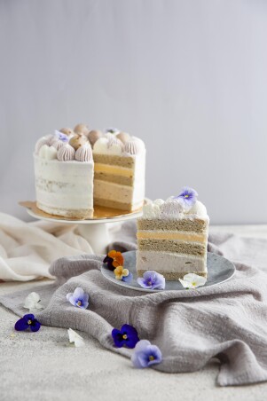 蛋糕皆選用新鮮、高級食材製成,放上滿滿的鮮花,直接秒殺大家底片!4款蛋糕基底皆是伯爵茶香蛋糕,口感非常濕潤綿密,茶香味非常濃郁,內餡則加入了布丁、芋泥,甜而不膩的口感讓人一吃就愛上!